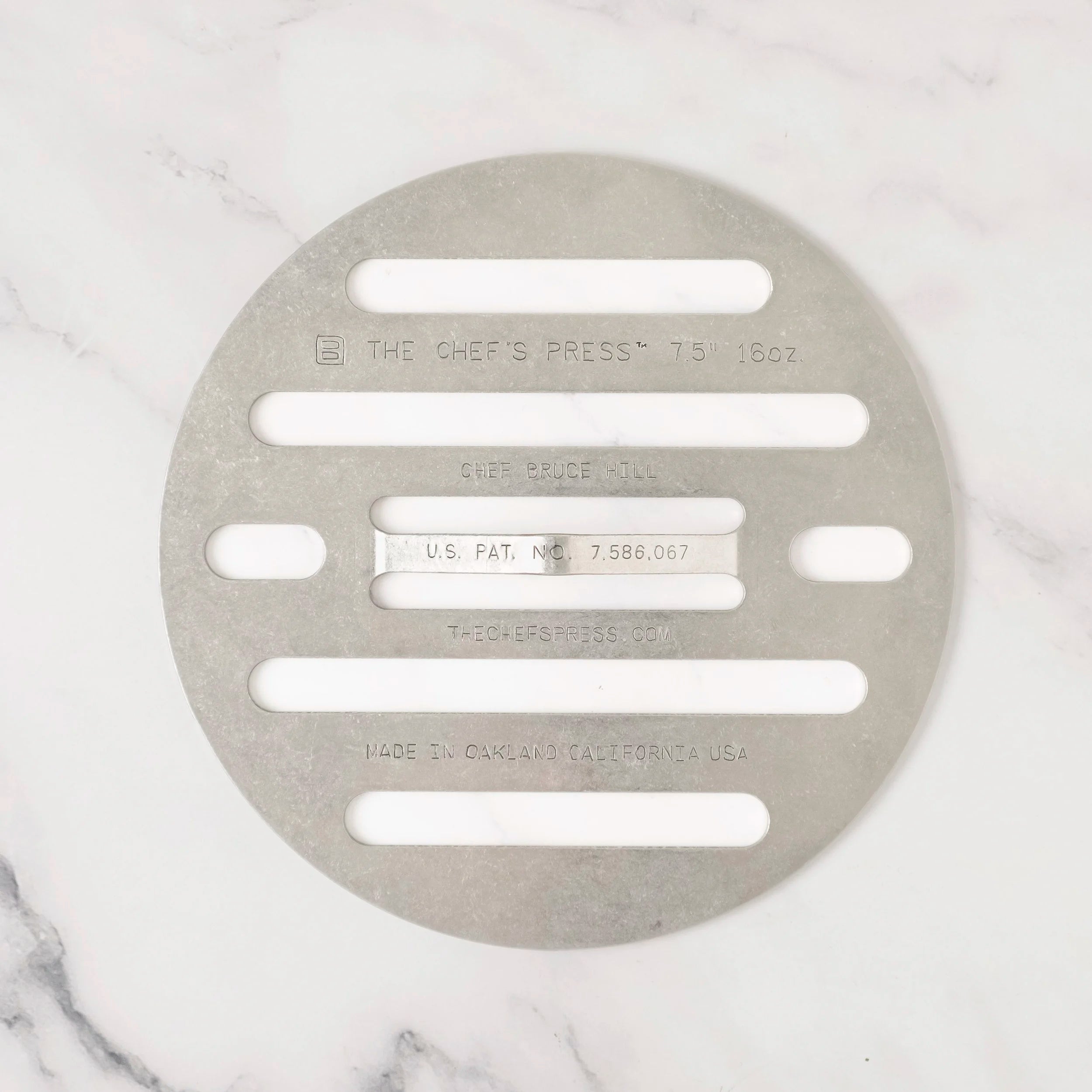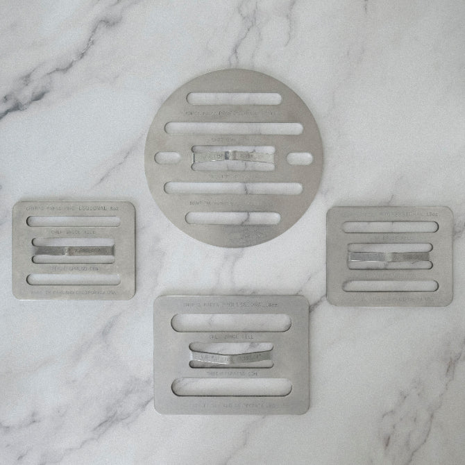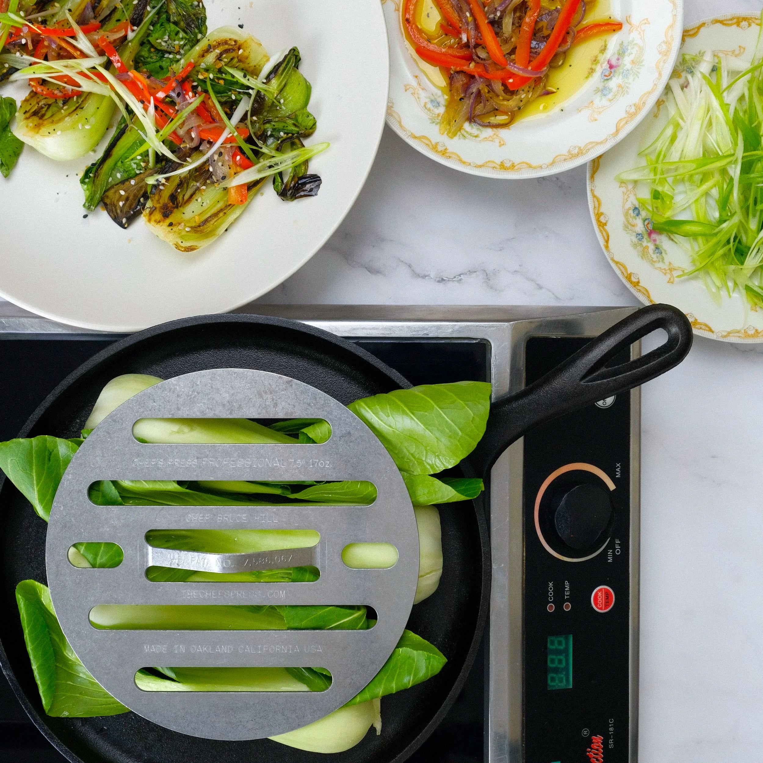 The third generation press, the 16 oz. Chef’s Press was designed for items with more density. Can be used in a staggered arrangement to cover larger items.